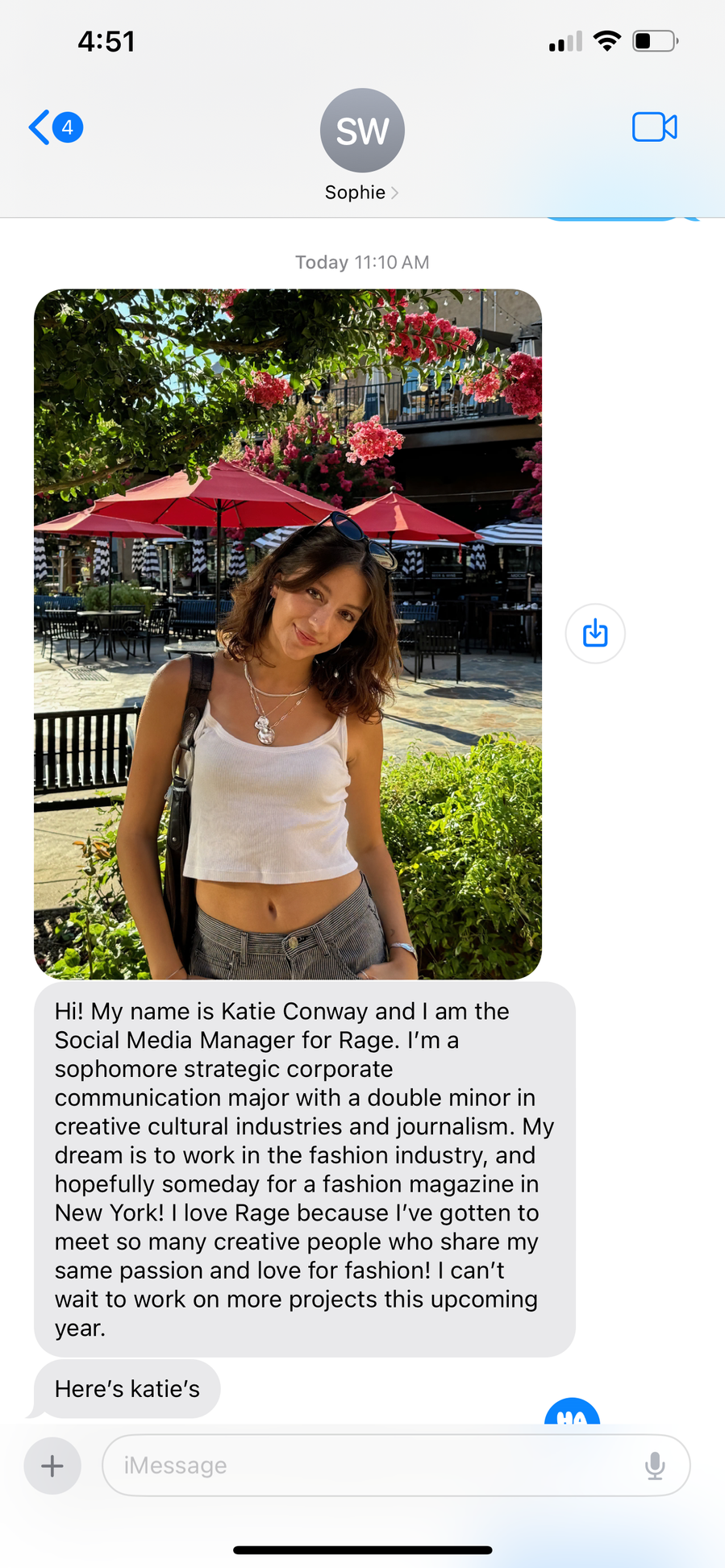 Katie Conway is the Social Media Manager for Rage. She is a sophomore strategic corporate communication major with a double minor in creative cultural industries and journalism. Her dream is to work in the fashion industry and, hopefully someday for a fashion magazine in New York! She loves Rage because she's gotten to meet so many creative people who share her passion and love for fashion. She cannot wait to work on more projects this upcoming year.