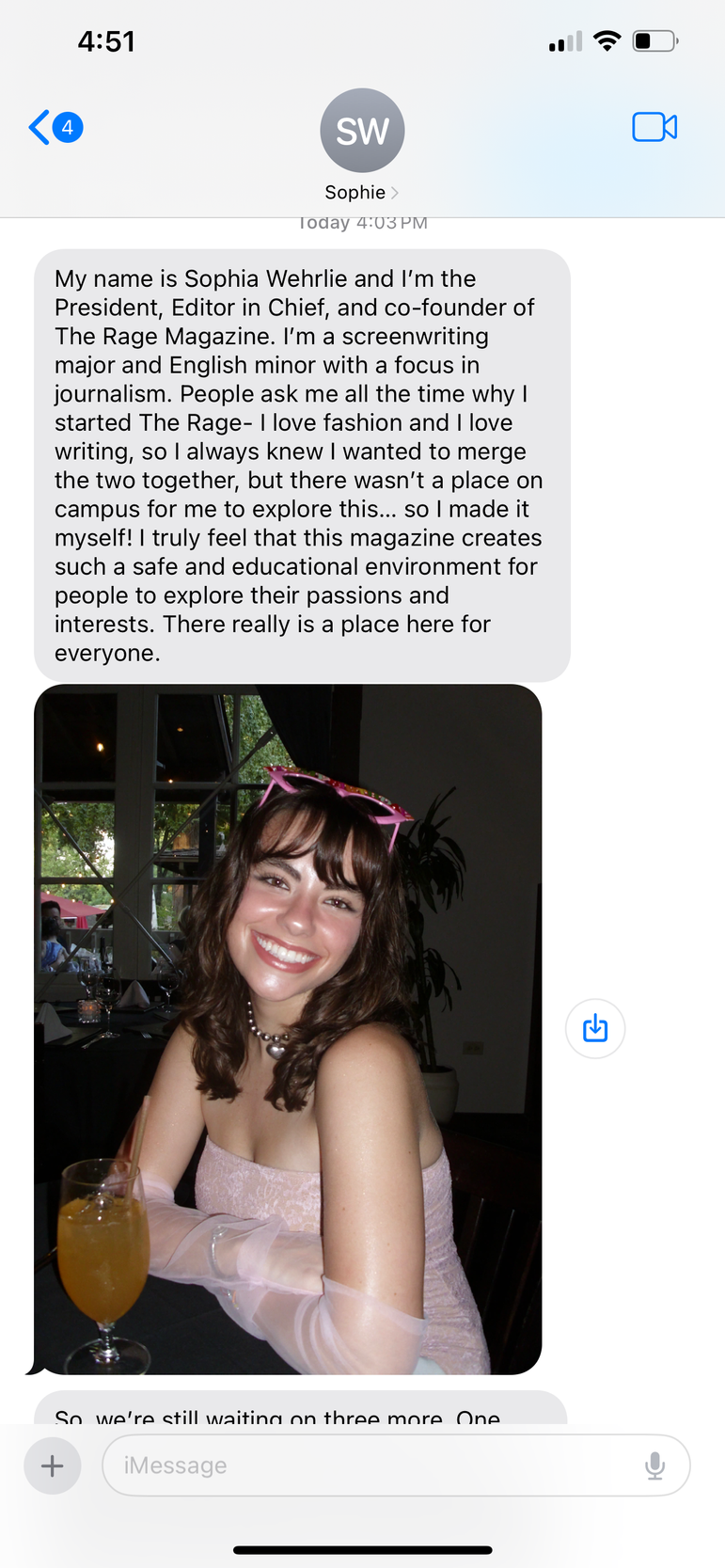 Sophie Wehrlie is the President, Editor in Chief, and co-founder of The Rage Magazine. She’s a screenwriting major and English minor with a focus in journalism. People ask all the time why she started The Rage. The answer to that is that she has always loved fashion and writing, and she always knew she wanted to merge the two together, but there wasn’t a place on campus for her to explore this, so she made one herself. This magazine creates such a safe and educational enviornment for people to explore their passions and interests. There really is a place here for everyone!